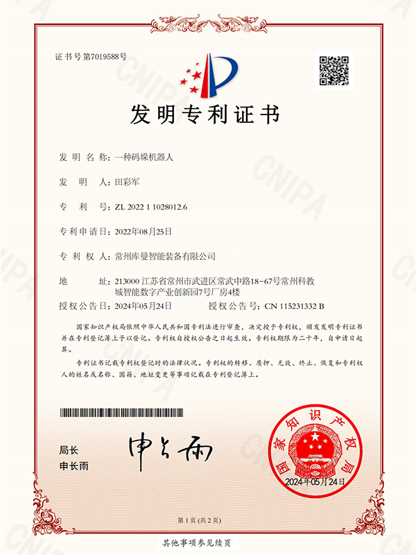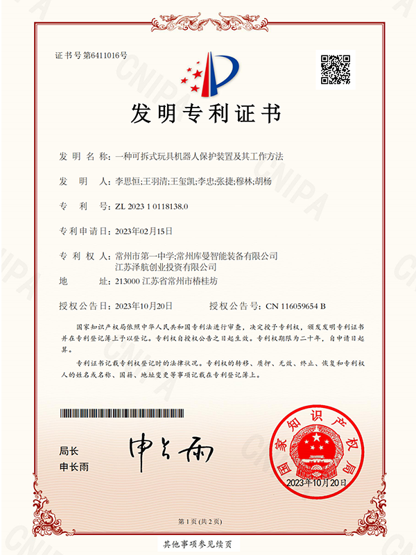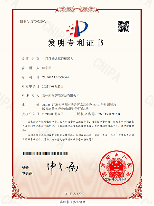 库曼机器人在机器人领域经过了多年的技术积累,在自主知识产权体系建设方面取得了显著成成果,在AI领域共获得实用新型专利2项,软件著作权14项;在机器人本体领域,共获得发明专利4项,实用新型专利6项,软件著作专利7项,以下是部分专利证书展示 。
